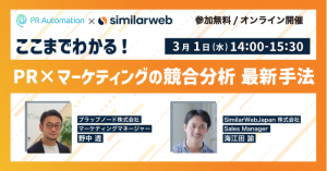 広報PRのデジタルトランスフォーメーション(DX)を推進するプラップノード株式会社(東京都中央区、代表取締役:渡辺幸光、以下 プラップノード)は、ウェブサイトとアプリの分析ツール「SimilarWeb」を開発販売するSimilarWeb Japan株式会社(東京都千代田区、ゼネラルマネジャー:田中晃)と共同で、「ここまでわかる!PR x マーケティングの競合分析 最新手法」をテーマにしたオンラインセミナーを2023年3月1日(水)に開催します。 本セミナーでは、マーケティングの成果向上に必要不可欠な“競合分析”について、広報視点での考え方や手法を解説します。 PRとマーケティングの連携が必要だと感じながら、何から手をつけたらいいのか分からない、どうやって深掘りすればいいか分からない、という方に向けた基礎的な内容です。 PRとマーケティング両面からのアプローチによって分析の幅を広げることで、より高度な現状把握・施策立案につなげていただくことを目指します。