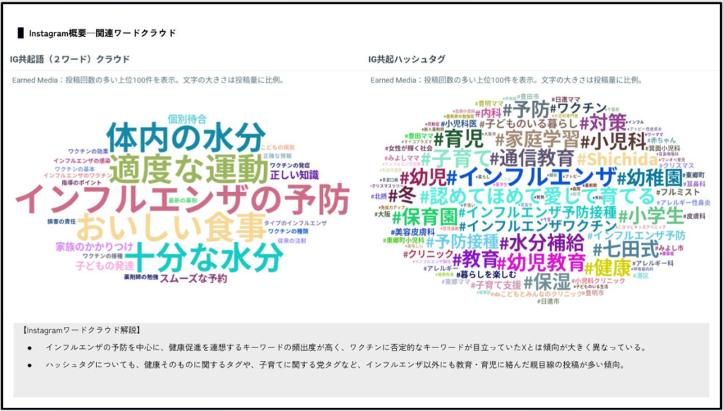 AI分析オートメーションの活用イメージとして、「小児のインフルエンザワクチン接種率向上」をテーマにした分析レポートのサンプル版をご用意しています。SNSやWEB記事をもとに、生活者の投稿傾向・情報拡散の構造・感情の可視化を実施し、広報戦略上の課題と改善策を提示した内容です。